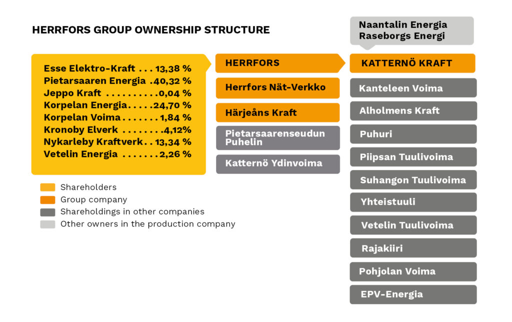 The Herrfors Group mainly consists of the parent company Oy Herrfors Ab, the subsidiaries Katternö Kraft Oy Ab and Herrfors Nät-Verkko, as well as the subsidiary group Härjeåns in Sweden. Our owners are primarily municipalities and their energy companies: Jakobstad Energi Ab, Nykarleby Kraftverk Ab, Vetelin Energia Oy, Kronoby Elverk Ab, Korpelan Voima/Korpelan Energia Oy, as well as the privately owned Esse Elektro-Kraft Ab. In other words, we are ultimately owned by the customers in the region where we operate.