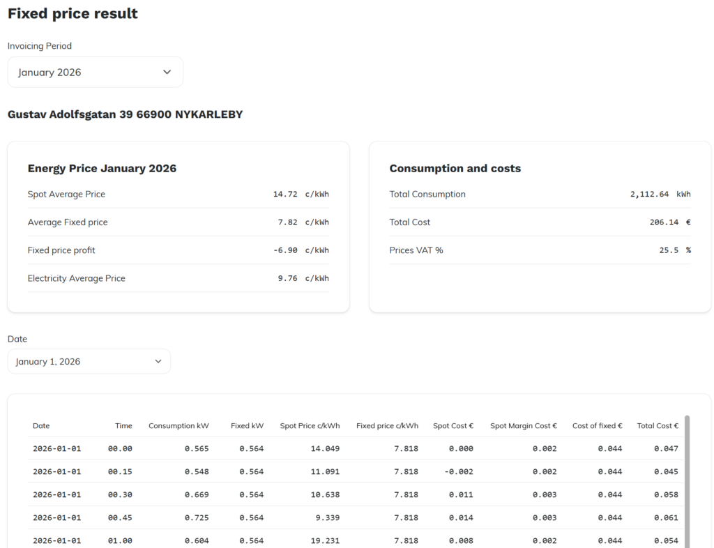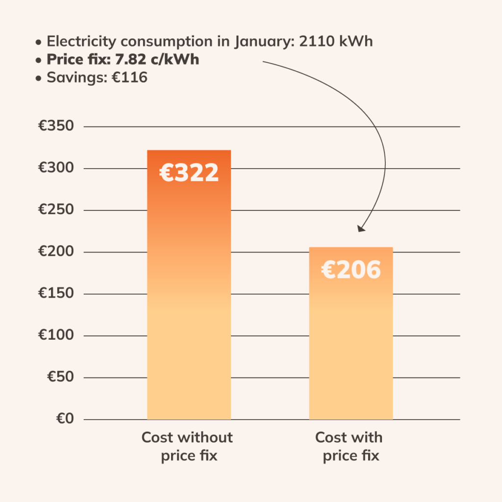 Here is a real example from one of our customers living in a detached house who fixed the price at 7.82 c/kWh for January 2026. By fixing the electricity price in advance, they saved €116 on their January electricity bill.
