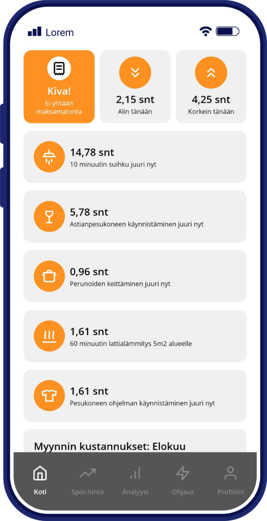 The control features available in the app give you the opportunity to reduce your electricity costs and use electricity during times when the load on Finland’s power grid is at its lowest. Our app is designed to meet the needs of private customers and help them become smarter electricity users. Please note that the cost estimate shown in the app is based solely on spot prices if you have a Stable+ contract or if you have price-secured your spot contract.