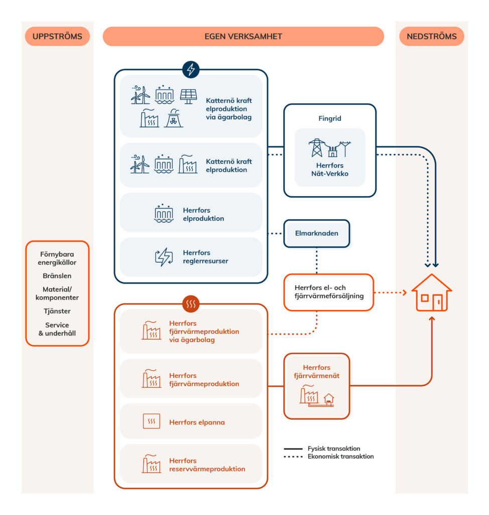 Herrforskoncernen består av flera bolag; Herrfors, Herrfors Nät-Verkko och produktionsbolagen Katternö Kraft. Illustrationen av koncernens värdekedja är uppdelad i el- och fjärrvärmeproduktion. Uppströms (den del av värdekedjan som sker före företagets egen verksamhet) från vår egna verksamhet finns förnybara energikällor, bränslen, material & komponenter, tjänster och service & underhåll som förädlas i vår egna verksamhet.