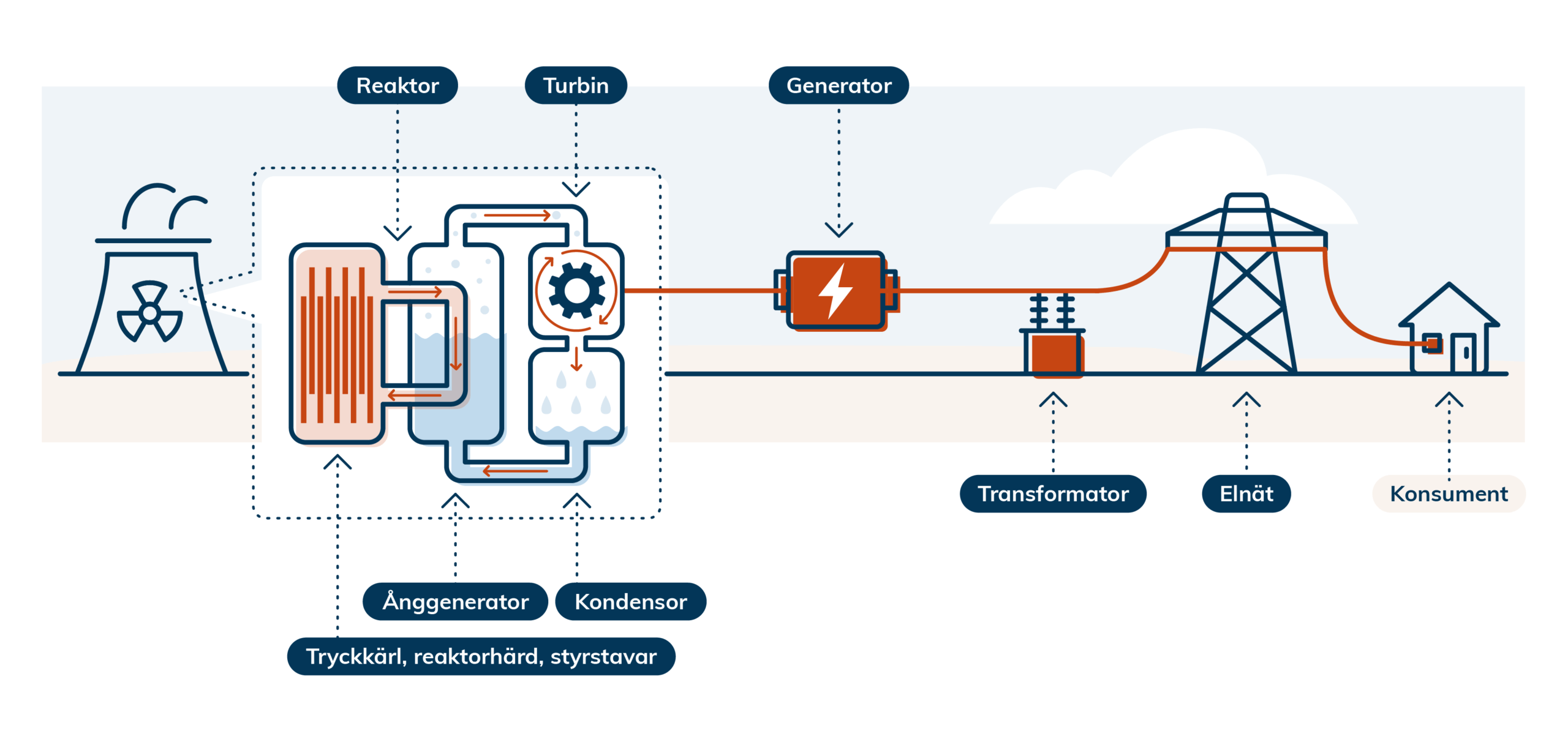 I en reaktor frigörs värme genom fission, vilket förångar vatten i en ånggenerator. Ångan driver en turbin som är kopplad till en generator. Generatorn omvandlar rörelseenergin till el, som sedan överförs via en transformator till elnätet och vidare till hem och företag.