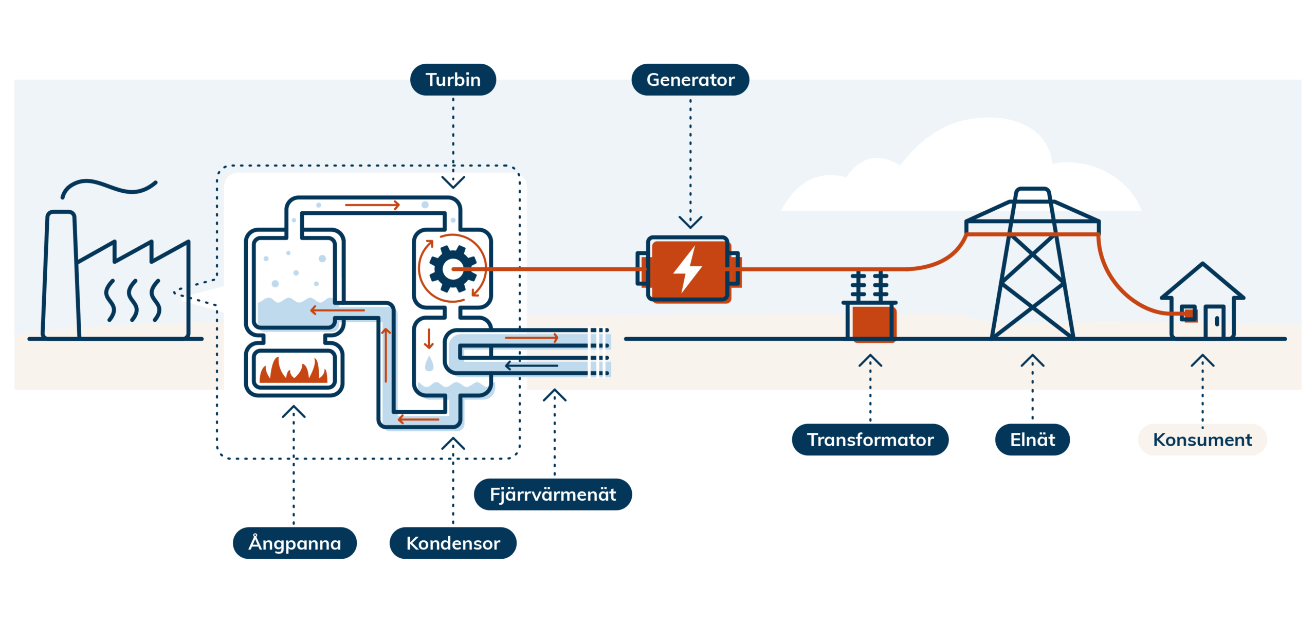 Bränsle används för att värma en ångpanna, där den ånga som bildas driver en turbin. Turbinen är kopplad till en generator som omvandlar rörelseenergin till elenergi. Den värme som samtidigt uppstår tas till vara och leds ut i fjärrvärmenätet. Elen överförs via en transformator till elnätet och därifrån vidare till konsumenterna. I processen produceras både el och värme effektivt från samma energikälla.