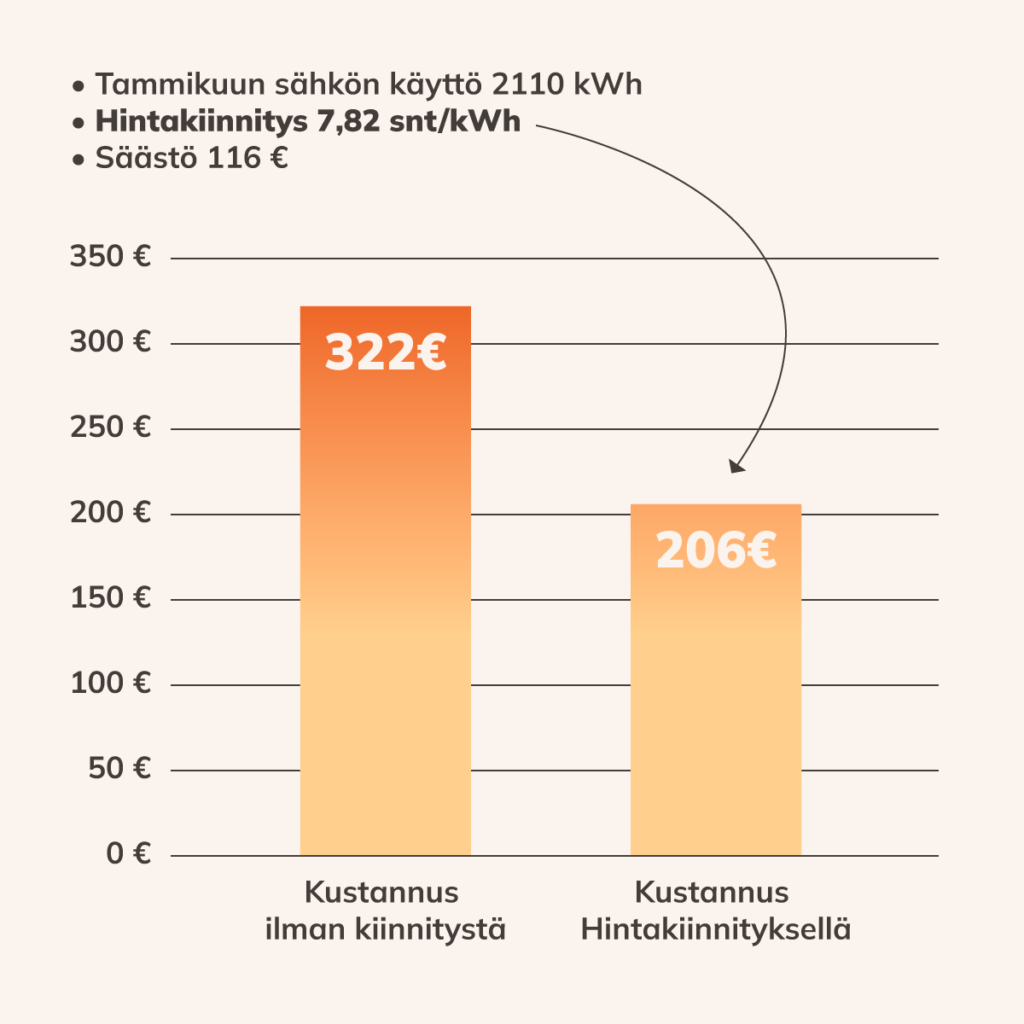Tässä aito esimerkki omakotitalossa asuvasta asiakkaastamme, joka teki hintakiinnityksen hinnalla 7,82 snt/kWh tammikuulle 2026. Kiinnittämällä sähkön hinnan etukäteen hän säästi 116 € tammikuun sähkölaskusta.