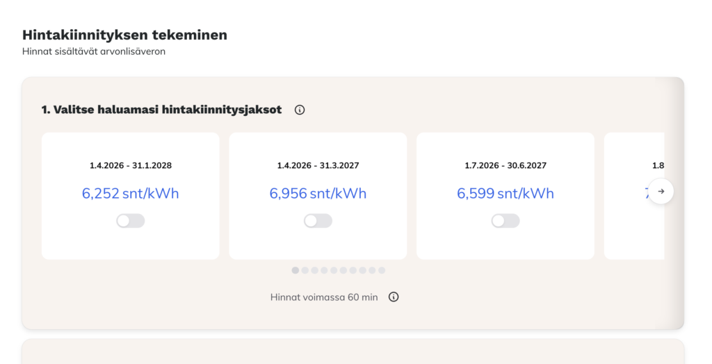 Voit itse päättää milloin, kuinka paljon ja minkä ajanjakson kiinnität. Sinulle tarjottu reaaliaikainen kiinnityshinta vaihtelee kiinnitysjakson ajankohdan ja pituuden mukaan. Voit tehdä hintakiinnityksiä koska tahansa, mutta viimeistään 3 vuorokautta ennen toimitusjakson alkua.