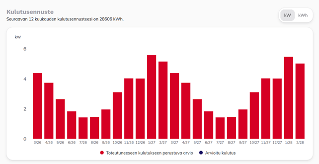Laskemme kuukausikohtaisen kulutusennusteesi edellisen vuoden kulutuksesi perusteella. Näin kiinnitys vastaa mahdollisimman hyvin todellista käyttöäsi. Ennuste päivittyy automaattisesti kulutushistoriasi mukaan sopimussuhteen aikana.