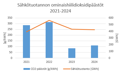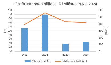 Sähköntuotannon hiilidioksidipäästöjen ja ominaispäästöjen kehitystä kuvaavat kuvat osoittavat, että päästöt ovat laskeneet neljän vuoden aikana. Suurimmillaan hiilidioksidipäästöt olivat 178 kt ja ominaispäästöt 315 g/kWh vuonna 2022. Vuonna 2024 päästöt olivat laskeneet 46 kt:hen ja 110 g/kWh:iin.
